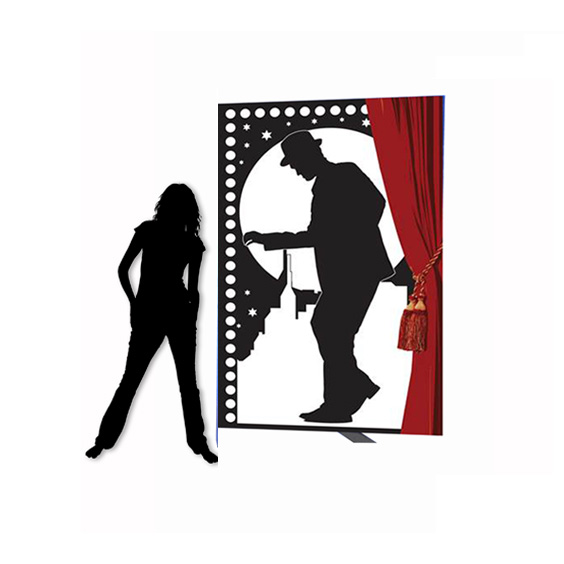 Our 1920s themed Gentleman Silhouette backdrop offers a photo opportunity, a fantastic entrance prop and a versatile background that can be repositioned as your event goes on. Equally at home in a Jazz or Gangsters theme, this Gentleman really comes to life when combined with other props in a theme.