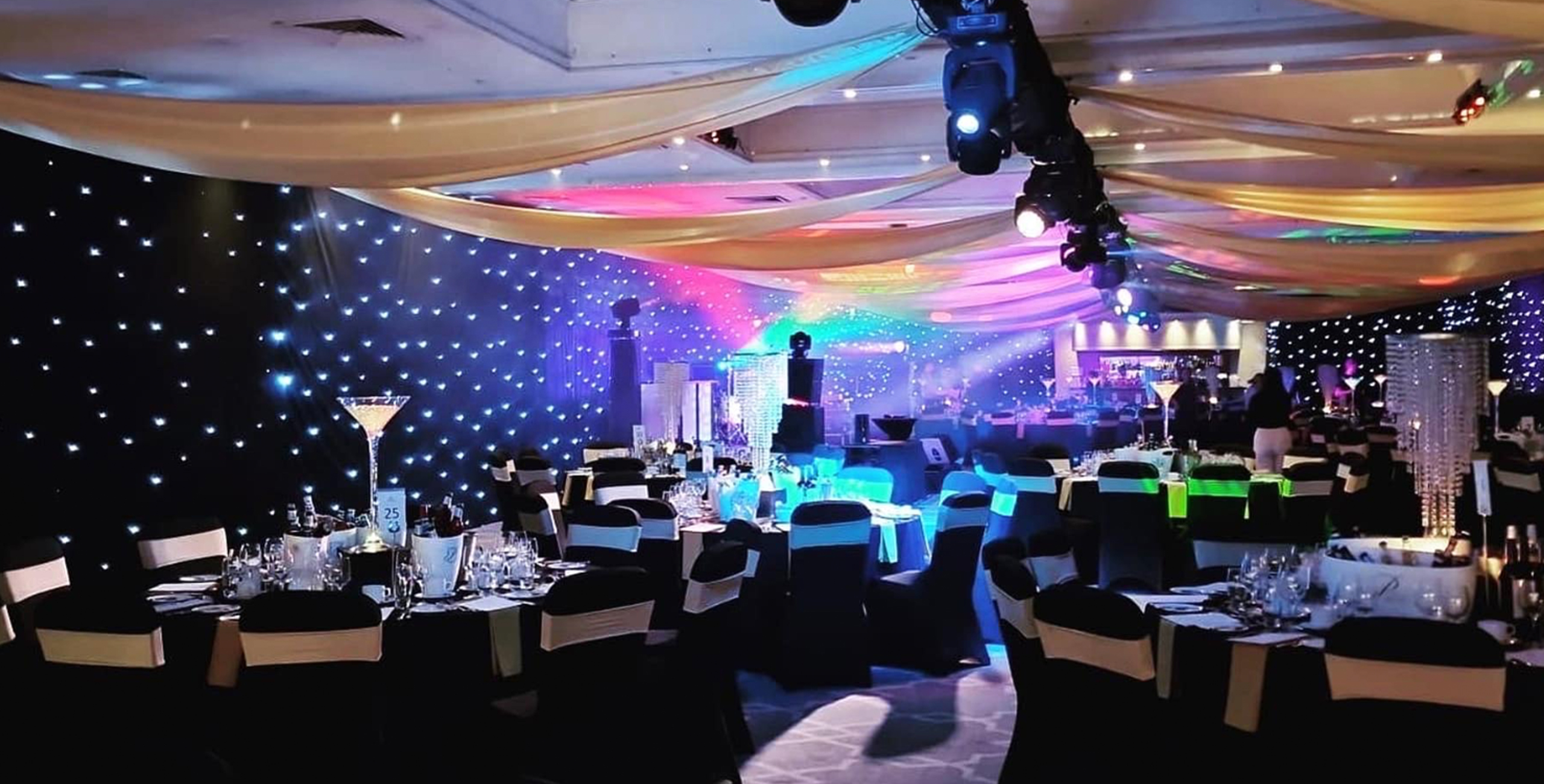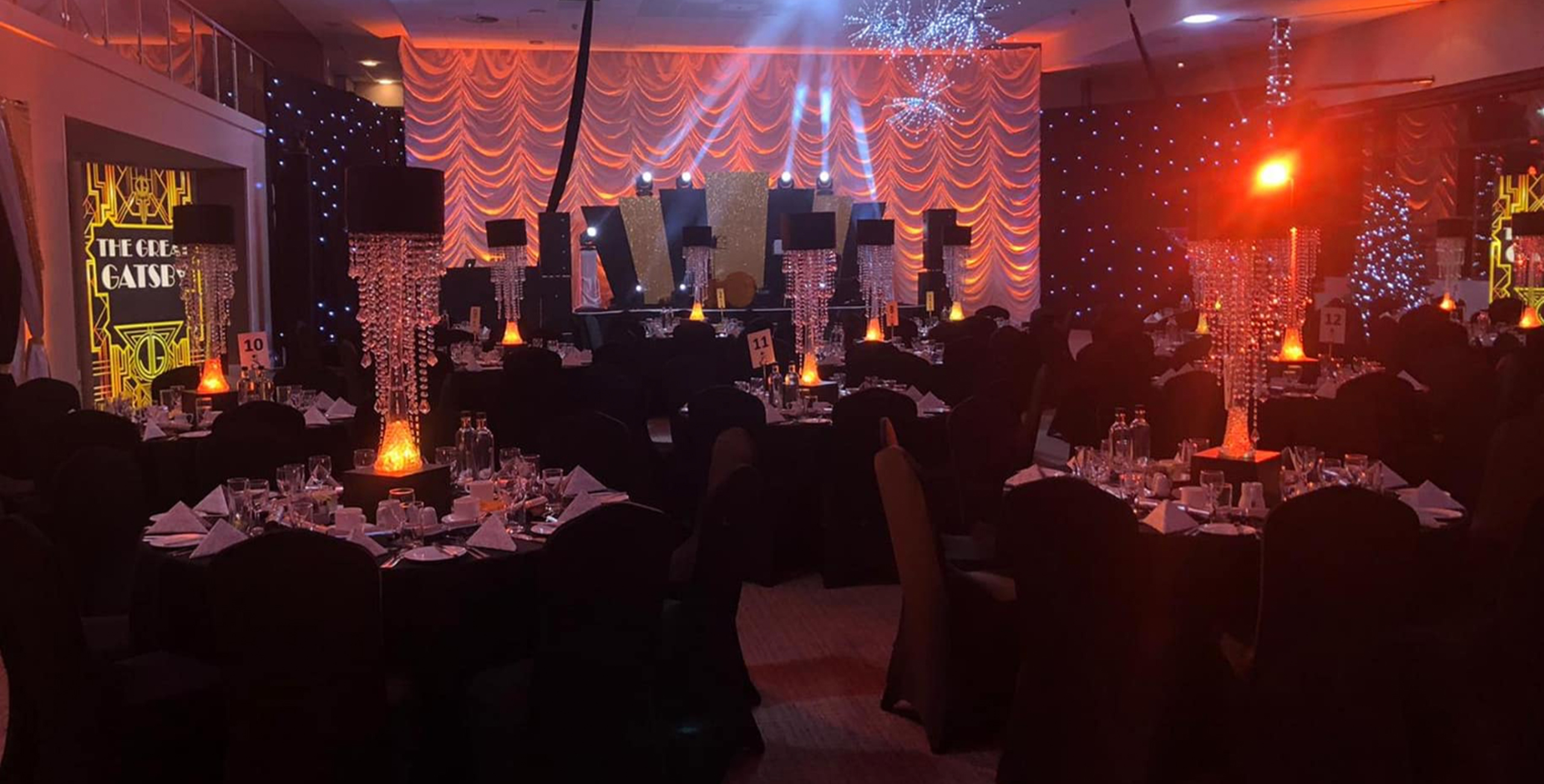 Your guests can walk our red carpet, through our draped entrance and past a VIP sign, making them feel special as they enter the venue. Huge 6m printed backdrops with a 1920s theme will catch their eye as they scan the room, walking past our 1920s silhouette panels and golden palm trees. The walls draped in black and glittering star cloth, tables shimmering with a mixture of jewels and huge feather centre pieces.