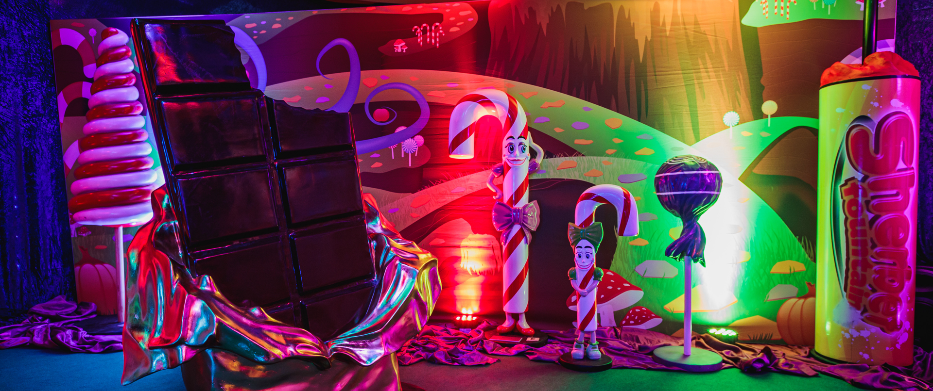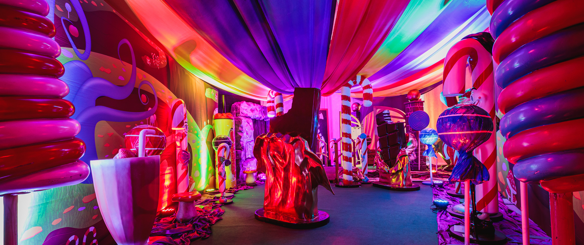You’ll be in awe of our towering 10ft lollipops, go wild for our oversized chocolate bars, and marvel at our 6ft candy canes! Everywhere you look will be filled with larger-than-life sweets and dessert-inspired décor. Plus, our luxurious purple carpets and draping will add the finishing touch, transforming your venue into a truly magical candy wonderland.