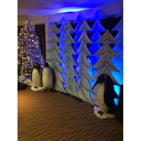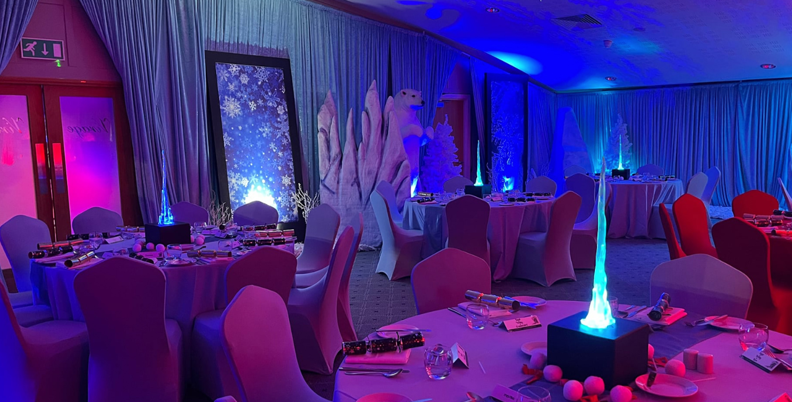 On the ice side of the room we have some stunning feature props. Our ice palace entrance will welcome guests to a more chilled out side of the room complete with ice pillars, stalagmites and guarded by our giant polar bear. Blue, white and purple drapes adorn the walls and our glittering white star cloth makes a real feature of this theme. We’ll even apply a cool room wash and icy blue up lights to add to the affect.