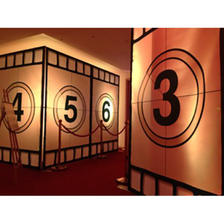 Once inside, the atmosphere builds. Our life size Hollywood legend props are spread out as far as the eye can see – famous actors and actresses around every corner! Star cloth draping sparkles on the walls and our giant film reels and silhouette panels add to the illusion that this is, in fact Hollywood and your guests really are the stars.