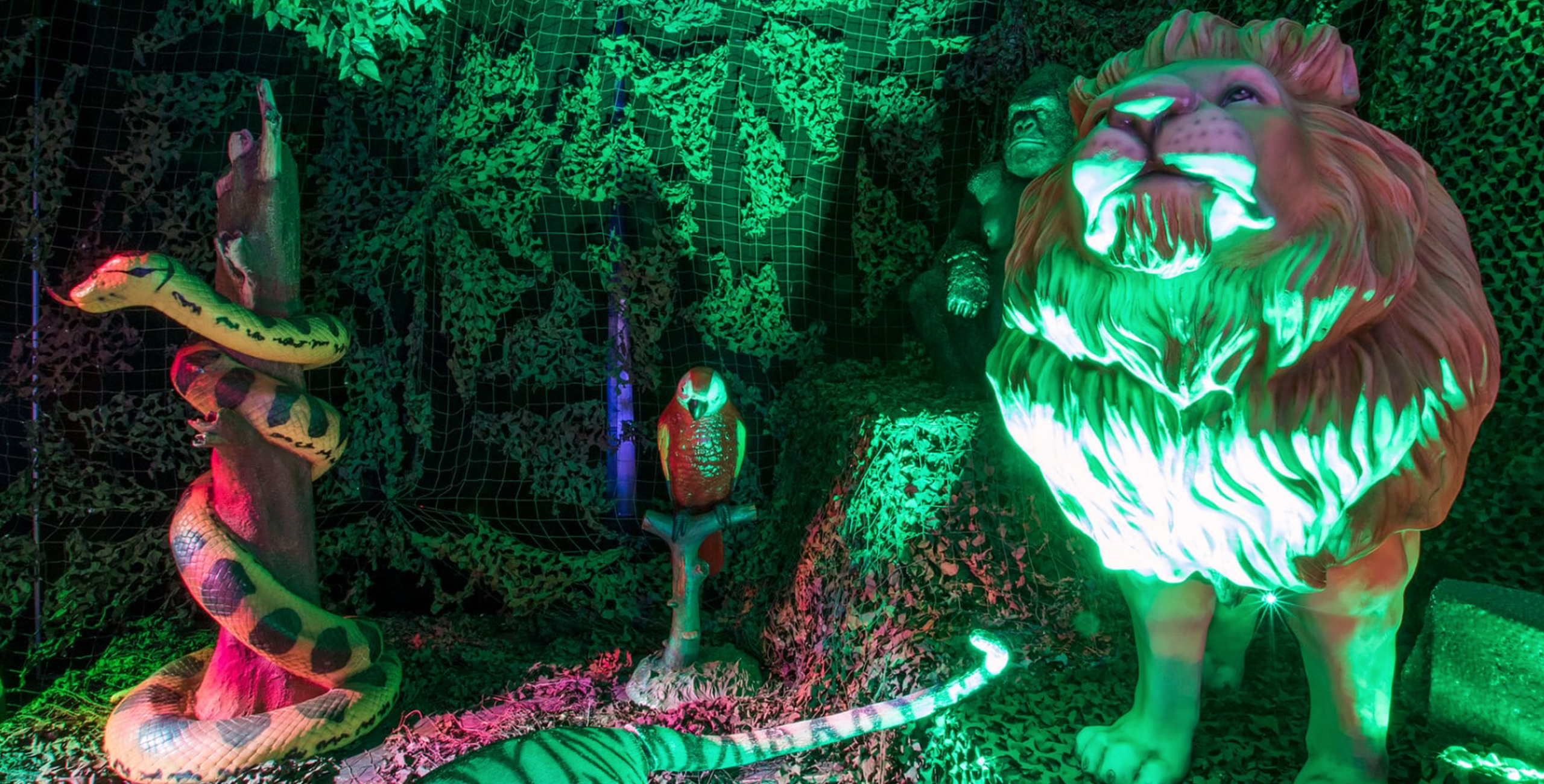 Our ‘Welcome to the Jungle’ animal skin sign will meet your guests and set the scene, but of course, it’s the wildlife that’s the star of the show! No jungle theme would be complete without animals and ours can be discovered around every bend. Our life size lion, tiger, elephant and giraffe will all love their new jungle home and our hanging chimps might cause a stir – keep your hands on your hats! As a final touch, we can even supply a little tropical mist with our low lying dry ice machines – perfect for that Rainforest atmosphere!