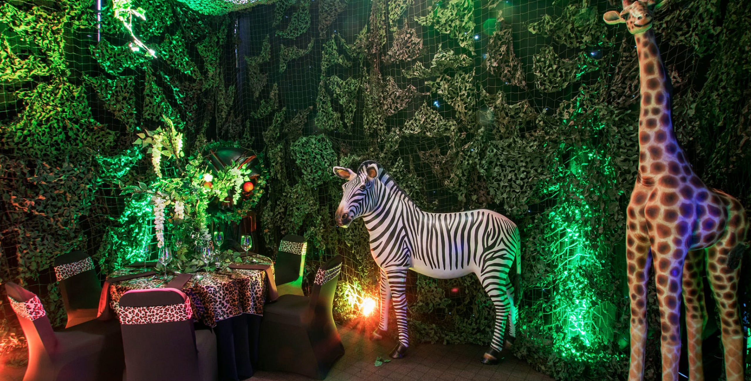 Whether your inspiration comes from Rudyard Kipling’s famous Jungle Book, the heroic adventures of Tarzan or a stunning Attenborough documentary, a small part of us is always drawn back to the trees and the magic and wonder that lay part-hidden behind the secretive world beyond the canopy. A great theme for student parties or any event where your guests will enjoy the fancy dress and chance to blend in, give us a call and we’ll transform your urban location into a jungle themed paradise!