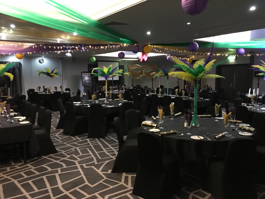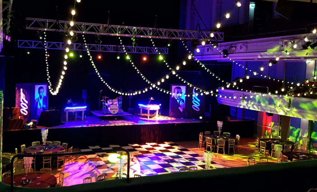 Our packages are based on up to 100 people attending at a hotel or event space. With a themed entrance, a themed stage area, a photo backdrop and 10 themed tables with chair covers and table centre.