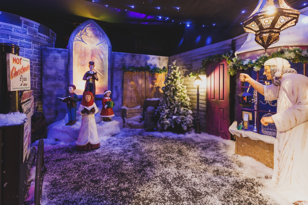 A historical twist featuring vintage street lanterns, cobbled street visuals, carol singers, gaslight-style lighting and period décor. Ideal for heritage venues or experiential Christmas trails.