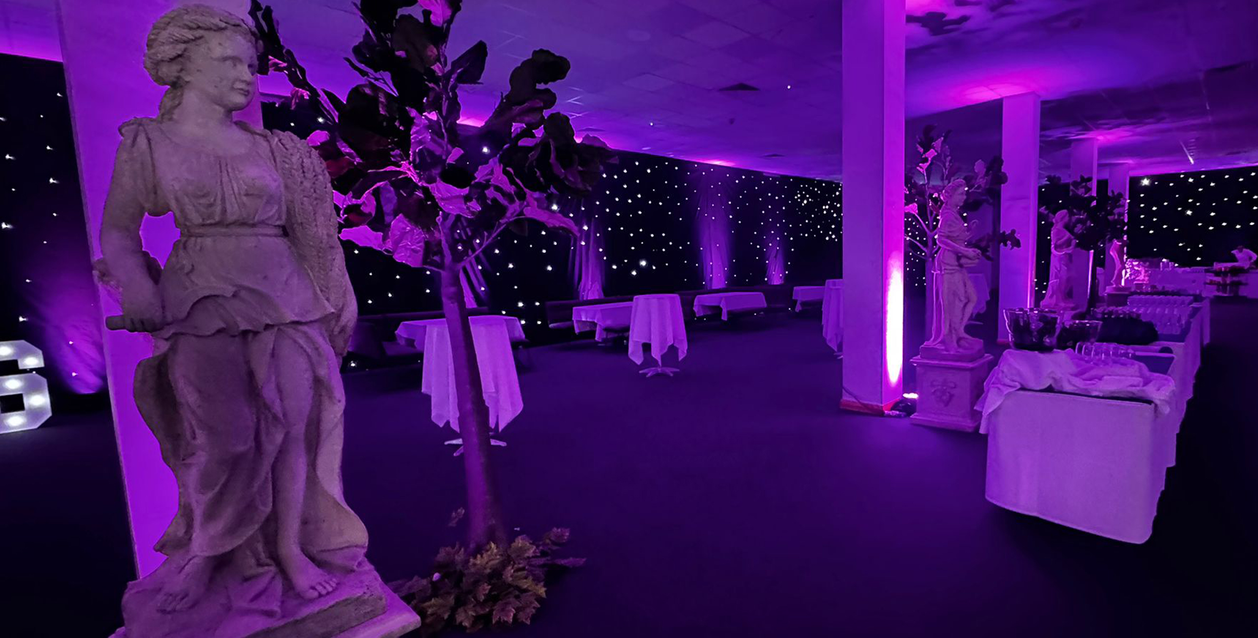 We’ll dress your venue with royal drapes and showcase our impressive Roman Centurion figure by carefully lighting it from below. Your tables will feature goblets and silverware fit for a Roman Commander while our lanterns light the walkways and our stone effect props and pillars bring the look and feel of Rome to your corner of the country. Our Roman statue props are brought to life in this setting and your guests will love the photo and ‘selfie’ opportunities that they generate.