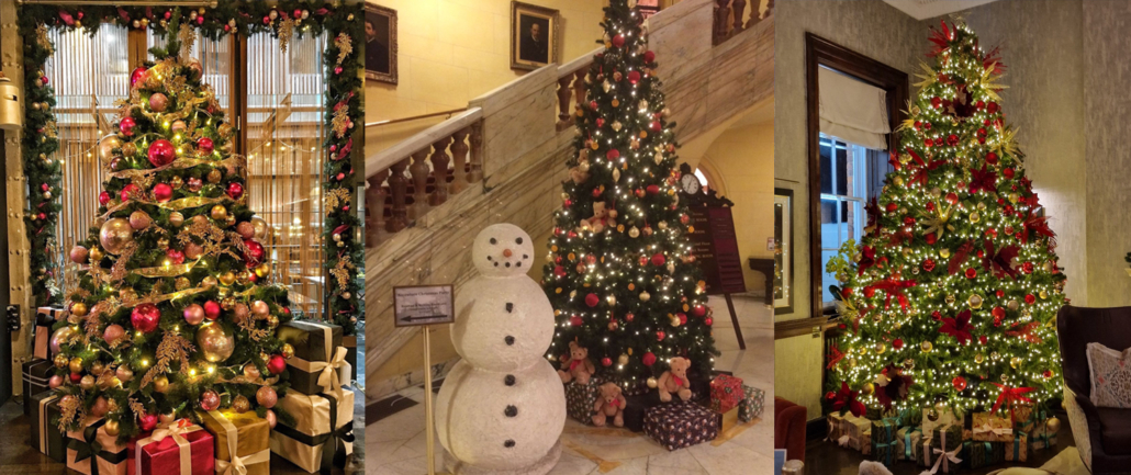 Professionally decorated Christmas trees (from 4ft to 20ft) in rich reds, golds, and forest greens